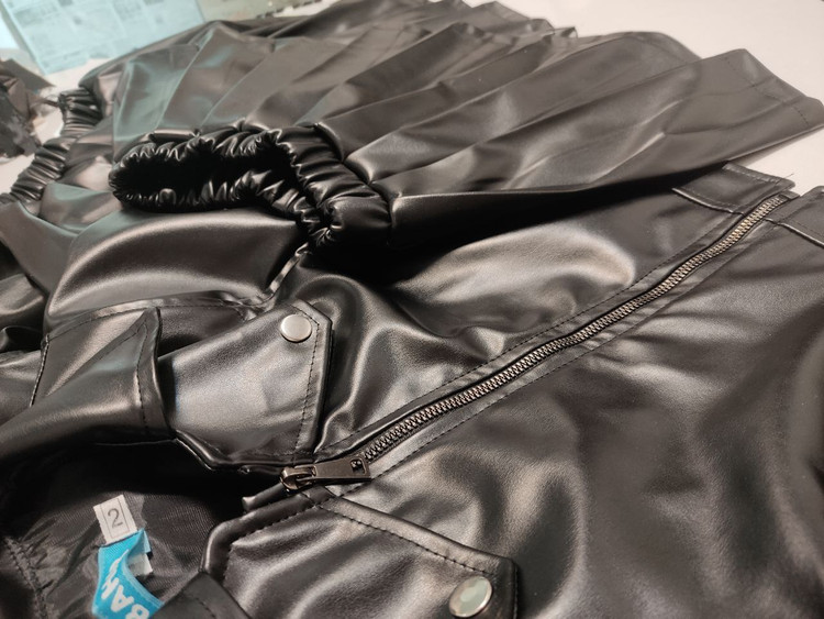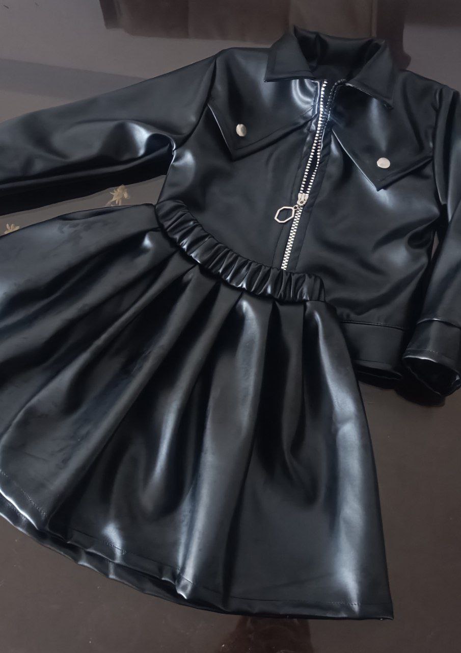 دوخت مزونی تمیز و دقیق این کار باعث میشود فرم کت روی تن کودک کاملاً مرتب بایستد و دامن با چینهای منظم، جلوهای خاص به استایل بدهد. استفاده از چرم تیرکمانی براق باعث شده لباس در نور آتلیه یا فضای باز جلوهای درخشان و لوکس پیدا کند.