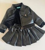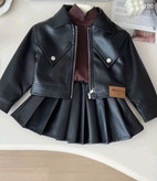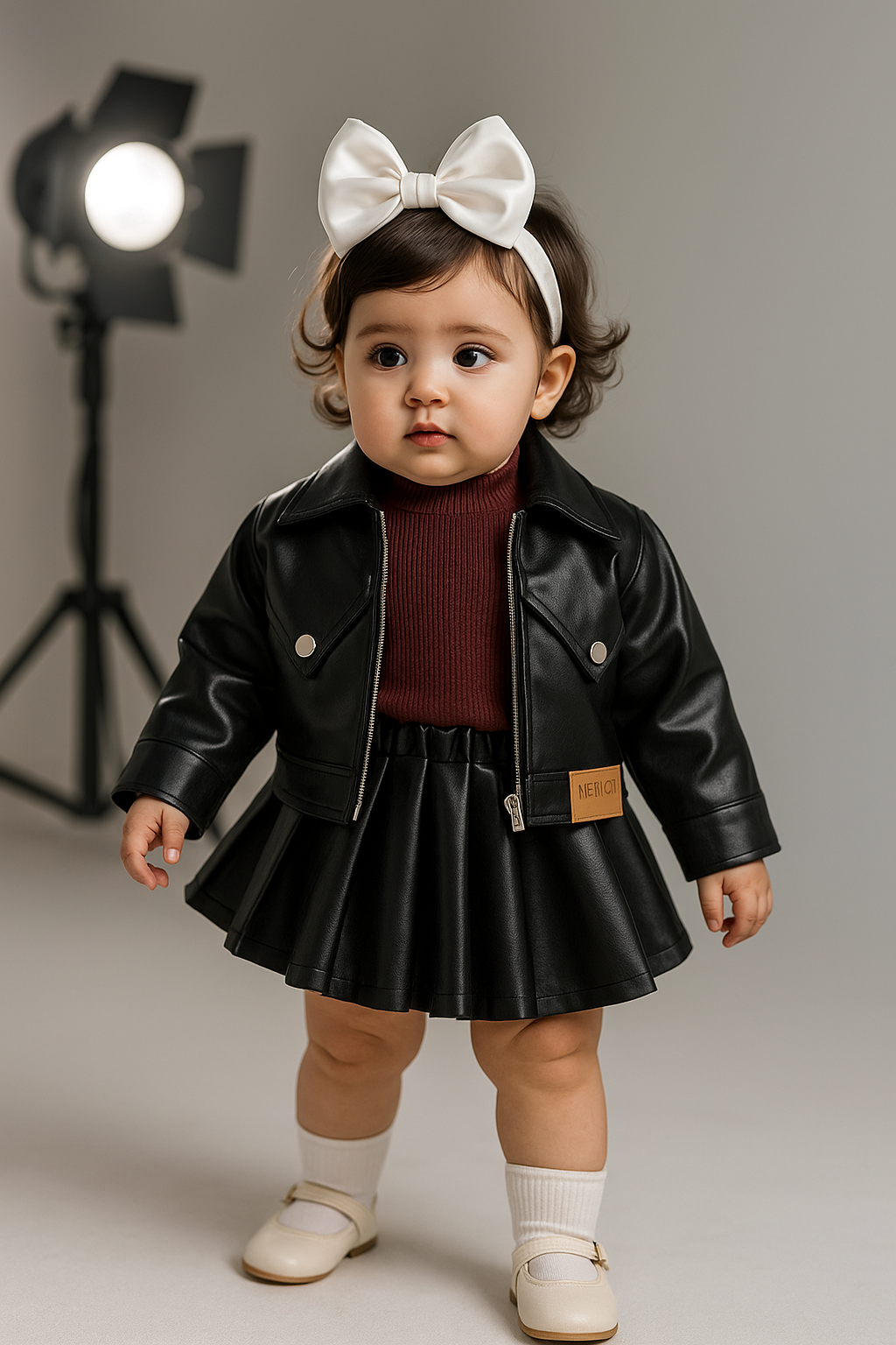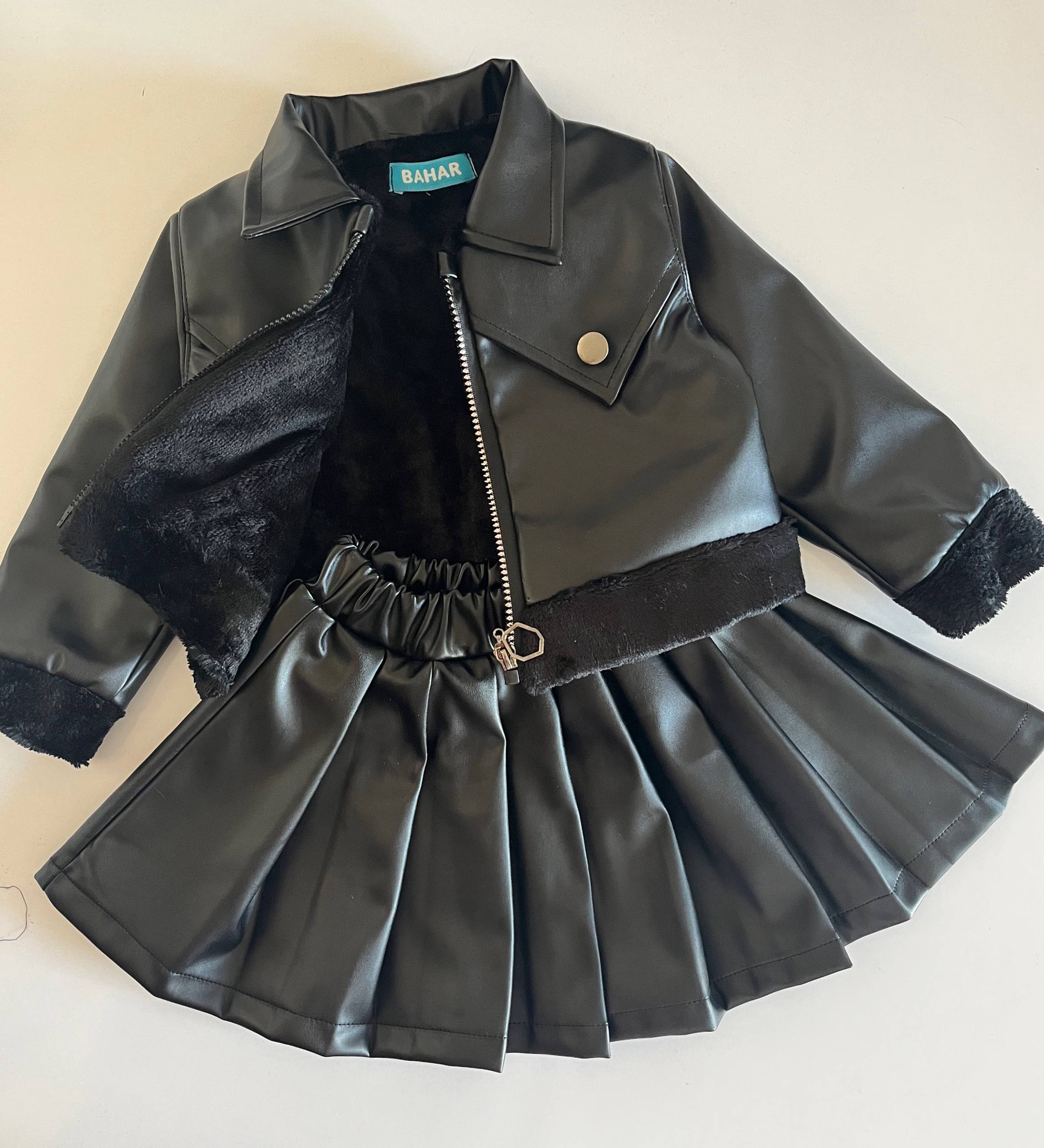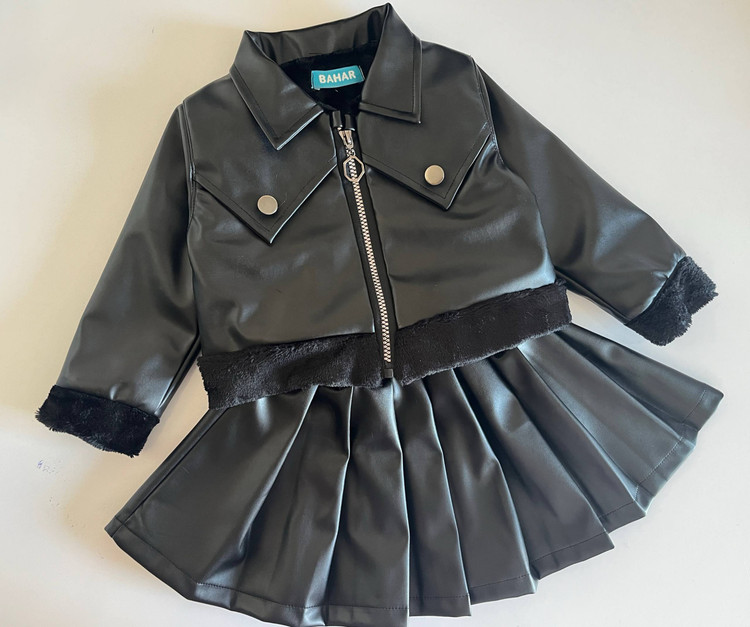 این ست خاص و دلبرانه شامل کت چرمی کوتاه، بلوز ظریف و دامن پلیسهای است که ترکیب آن، استایلی کاملاً مدرن و در عین حال کودکانه و لطیف ایجاد میکند.