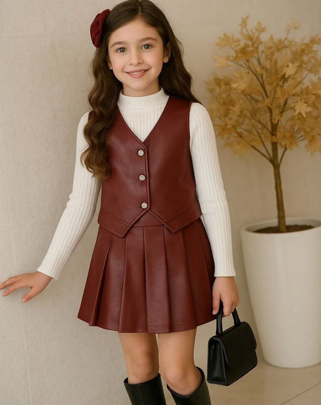 ست سهتیکه دخترانه مجلسی مدل لاکچری 🌸 جلیقه، بلوز و دامن چرمی شیک