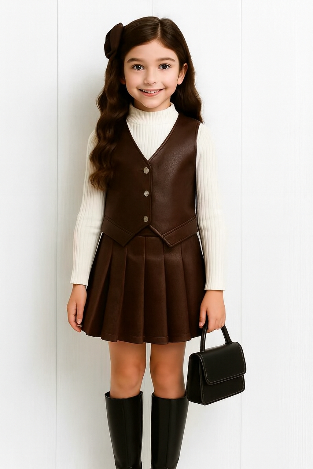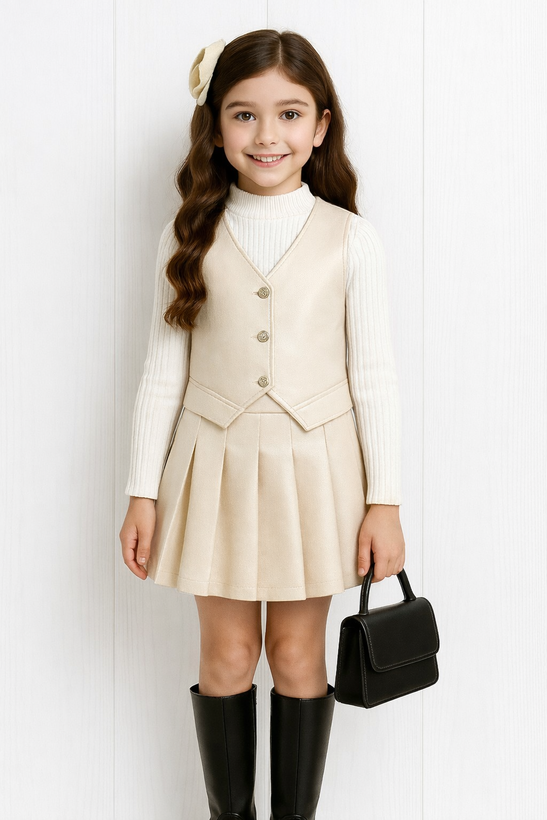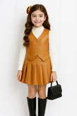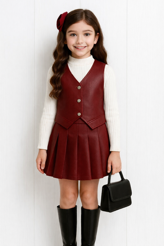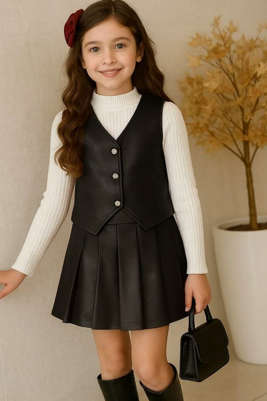 ست سه‌تیکه دخترانه مجلسی مدل لاکچری 🌸 جلیقه، بلوز و دامن چرمی شیک